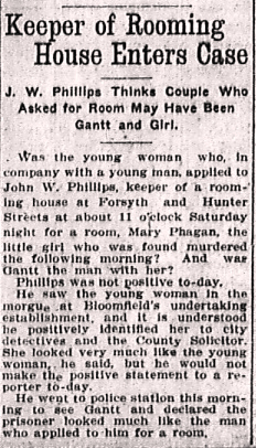 Was the young woman who, in company with a young man, applied to John W. Phillips, keeper of a rooming house at Forsyth and Hunter Streets at about 11 o'clock Saturday night for a room, Mary Phagan, the little girl who was found murdered the following morning? And was Gantt the man with her?