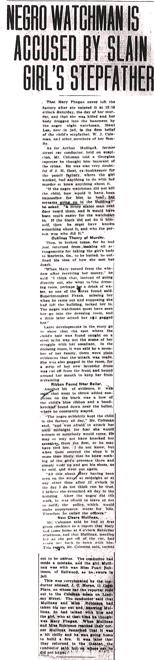 As for Arthur Mullinax, former street car conductor, held on suspicion, Mr. Coleman told a Georgian reporter he thought him innocent of the crime. He was also very doubtful if J. M. Gantt, ex-bookkeeper for the pencil factory, where the girl worked, had anything to do with her murder or knew anything about it.