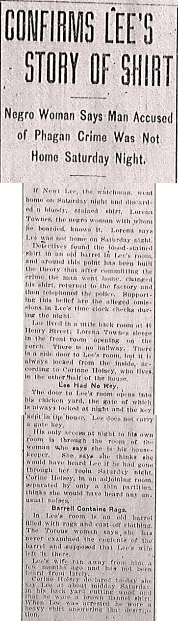 If Newt Lee, the watchman, went home on Saturday night and discarded a bloody, stained shirt, Lorena Townes, the negro woman with whom he boarded, knows it. Lorena says Lee was not home on Saturday night.
