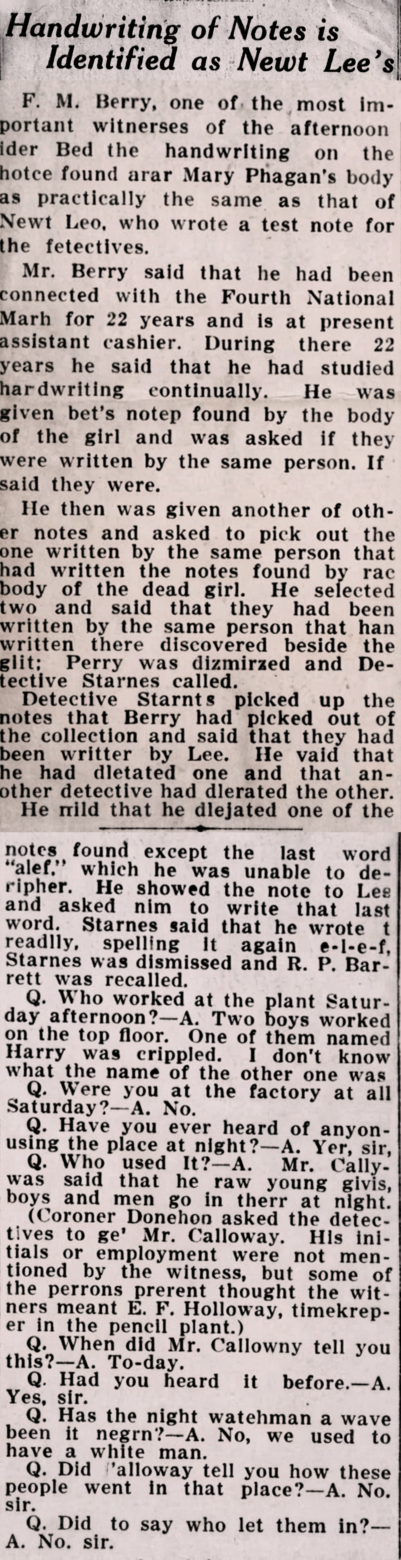 F. M. Berry, one of the most important witnesses of the afternoon, identified the handwriting on the notes found near Mary Phagan's body as practically the same as that of Newt Lee, who wrote a test note for the detectives.