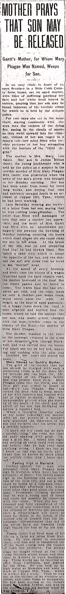 The mother is Mrs. Mary Lou Gantt. Her son is James Milton Gantt, the young bookkeeper who is held by the police as a suspect in the terrible murder of little Mary Phagan. Mrs. Gantt was prostrated when the news of her son's arrest was brought to her Monday morning. Her boy had been away from home for three long weeks, and during that time had narrowly escaped death in an accident at Copper Hill, Tenn., where he had been working.
