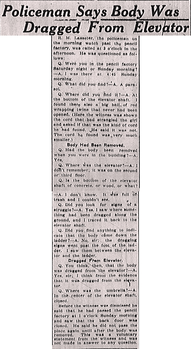 R. M. Lasseter [sic], the policeman on the morning watch past the pencil factory, was called at 3 o'clock in the afternoon. He was questioned as follows: