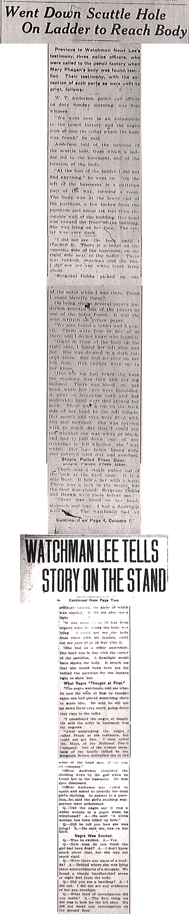 Previous to Watchman Newt Lee's testimony, three police officers, who were called to the pencil factory when Mary Phagan's body was found, testified. Their testimony, with the exception of such parts as were unfit to print, follows: