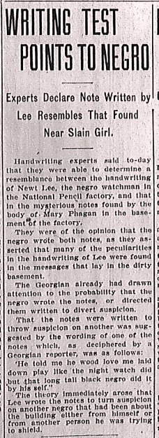 Handwriting experts said to-day that they were able to determine a resemblance between the handwriting of Newt Lee, the negro watchman in the National Pencil factory, and that in the mysterious notes found by the body of Mary Phagan in the basement of the factory.