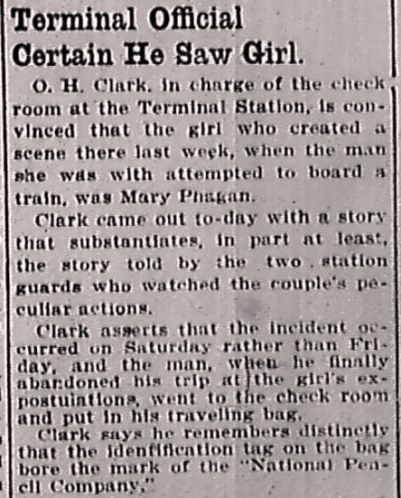 O. H. Clark, in charge of the check room at the Terminal Station, is convinced that the girl who created a scene there last week, when the man she was with attempted to board a train, was Mary Phagan.