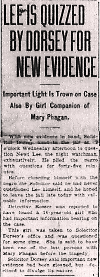 With new evidence in hand, Solicitor Dorsey went to the jail at 3 o'clock Wednesday afternoon to question Newt Lee, the night watchman, exhaustively. He plied the negro with questions for forty-five minutes.