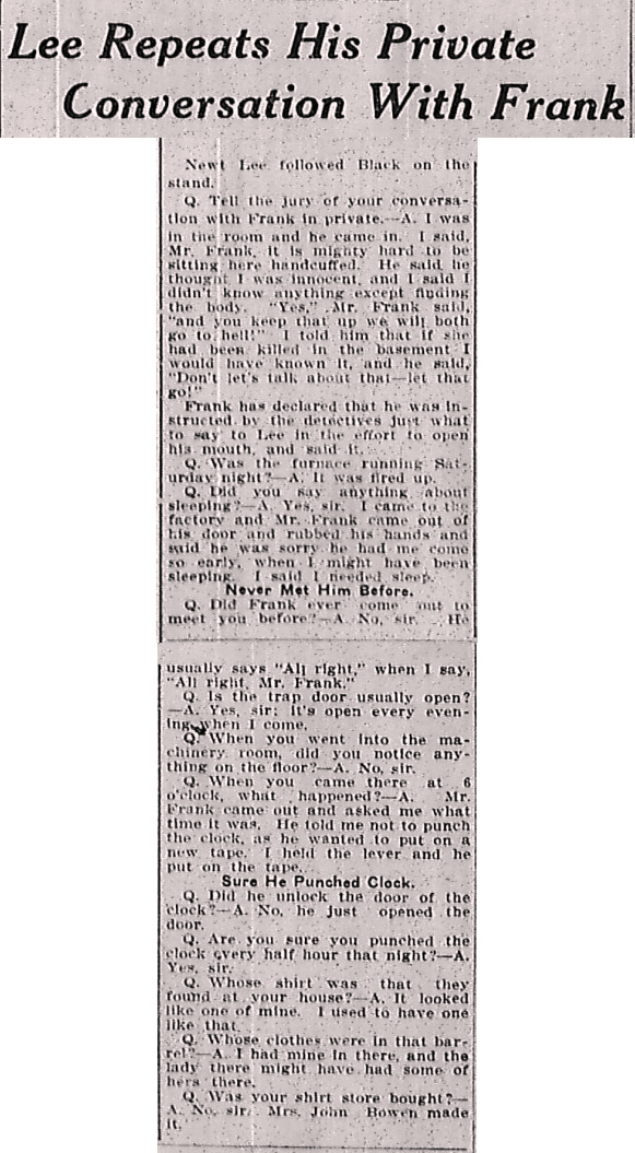 Frank has declared that he was instructed by the detectives just what to say to Lee in the effort to open his mouth, and said it.