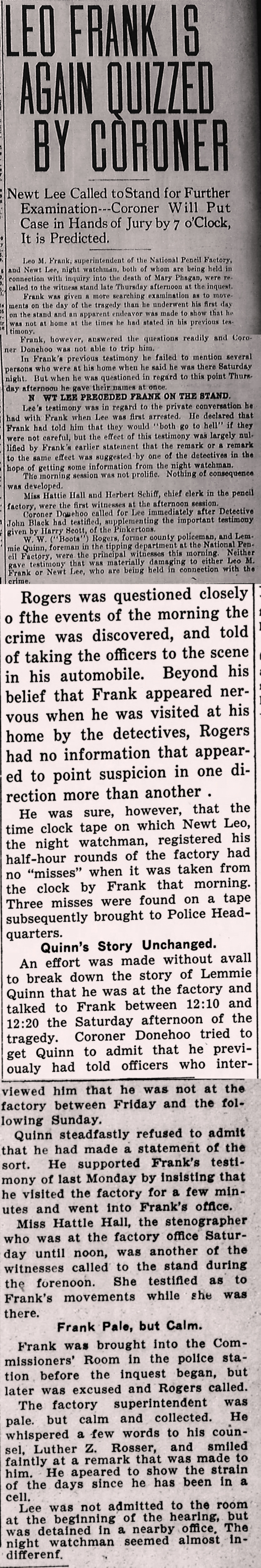 W. W. ("Boots") Rogers, former county policeman, and Lemmie Quinn, foreman in the tipping department at the National Pencil Factory, were the principal witnesses this morning. Neither gave testimony that was materially damaging to either Leo M. Frank or Newt Lee, who are being held in connection with the crime.
