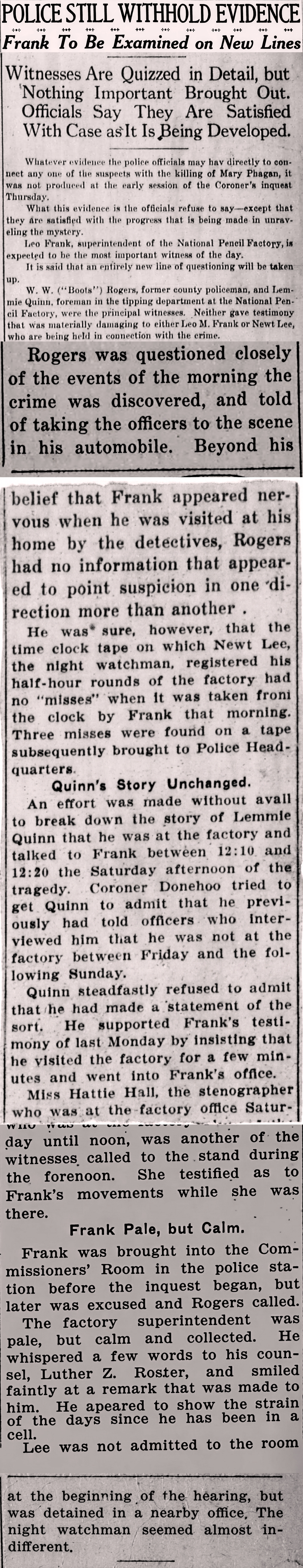 W. W. ("Boots") Rogers, former county policeman, and Lemmie Quinn, foreman in the tipping department at the National Pencil Factory, were the principal witnesses. Neither gave testimony that was materially damaging to either Leo M. Frank or Newt Lee, who are being held in connection with the crime.