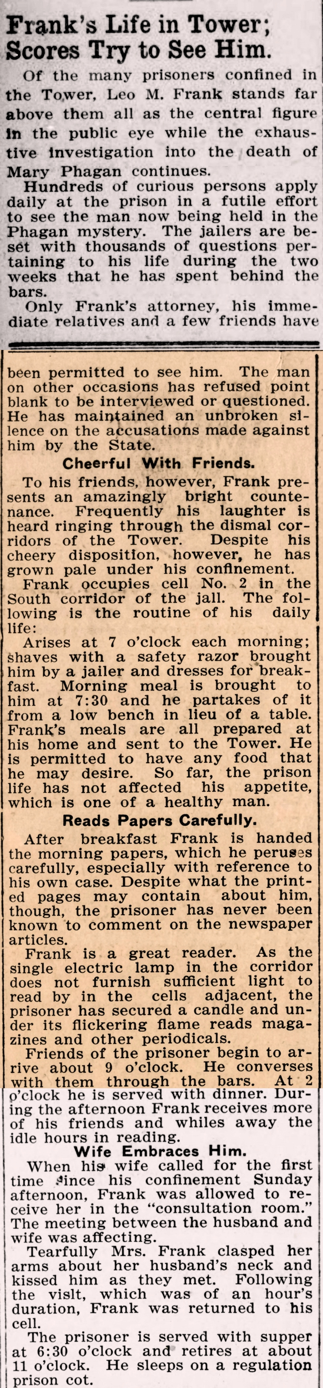 Of the many prisoners confined in the Tower, Leo M. Frank stands far above them all as the central figure in the public eye while the exhaustive investigation into the death of Mary Phagan continues.