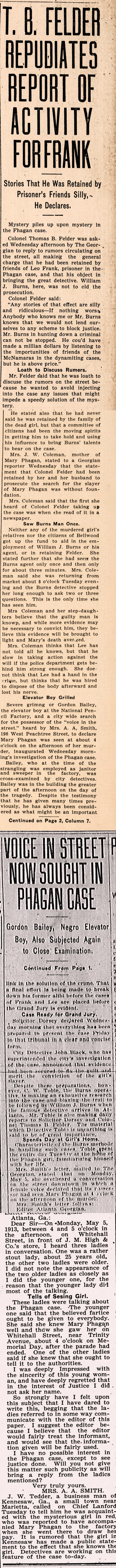 Colonel Thomas B. Felder was asked Wednesday afternoon by The Georgian to reply to rumors circulating on the street, all making the general charge that he had been retained by friends of Leo Frank, prisoner in the Phagan case, and that his object in bringing the great detective, William J. Burns, here, was not to aid the prosecution.