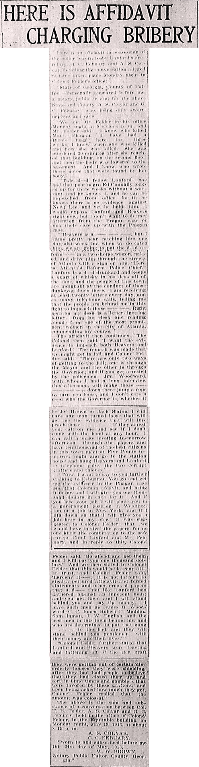 The affidavit then continues: "The Colonel then said, ‘I want the evidence to impeach both Beavers and Lanford.' The remark was made that we might get in jail, and Colonel Felder said: ‘There are only two ways of getting to the jail; one is through the Mayor and the other is through the Governor; and if you get arrested by the policemen. Jim Woodward, with whom I had a long interview this afternoon, will make those — — — — down there jump a rope to turn you loose, and I don't care a d—d who the Governor is, whether it be Joe Brown or Jack Slaton, I will have any man turned loose that will get me the evidence that will impeach those — — — —. If they arrest you, call on me and see if I don't come with the bond at any hour. I can call a mass meeting to-morrow afternoon through the papers and have ten thousand of the best citizens in this town meet at Five Points to-morrow night and go to the station house and hang Beavers and Lanford to telephone poles, the two corrupt grafters and thieves.'
