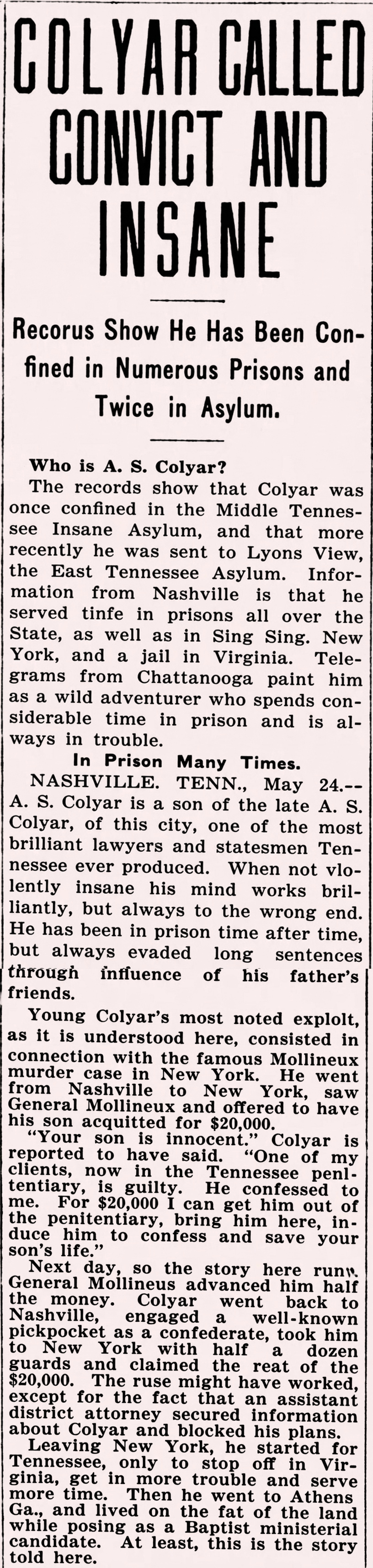 Young Colyar's most noted exploit, as it is understood here, consisted in connection with the famous Mollineux murder case in New York. He went from Nashville to New York, saw General Mollineux and offered to have his son acquitted for $20,000.