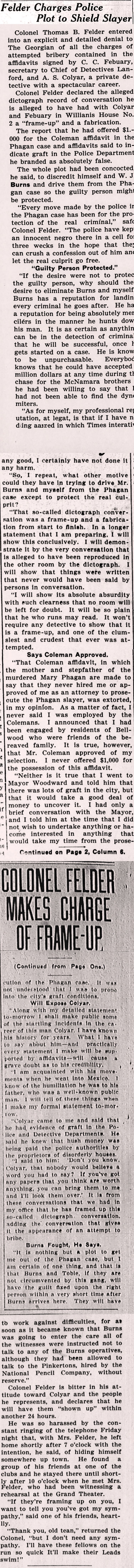 "Every move made by the police in the Phagan case has been for the protection of the real criminal," said Colonel Felder. "The police have kept an innocent negro there in a cell for three weeks in the hope that they can crush a confession out of him and let the real culprit go free.