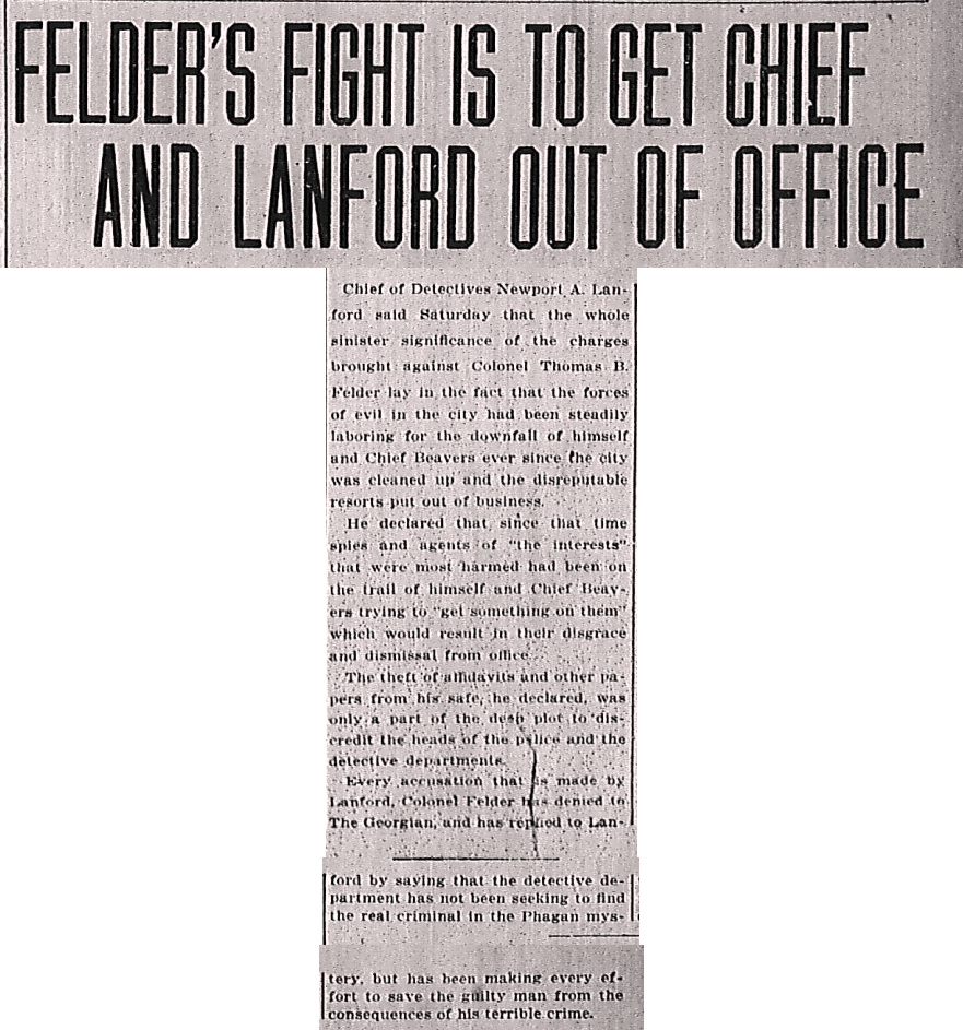 Every accusation that is made by Lanford, Colonel Felder has denied to The Georgian, and has replied to Lanford by saying that the detective department has not been seeking to find the real criminal in the Phagan mystery, but has been making every effort to save the guilty man from the consequences of his terrible crime.