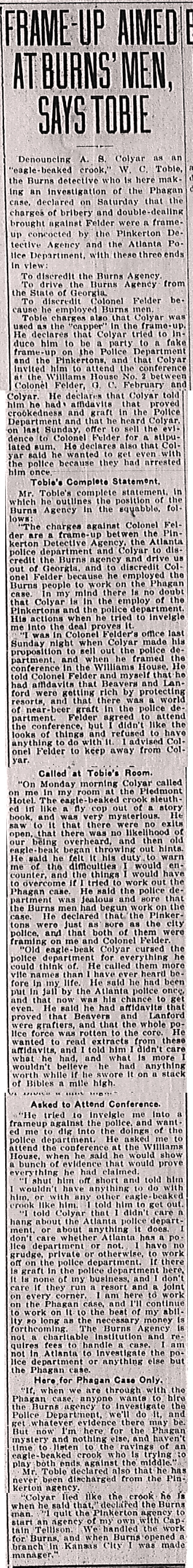 Denouncing A. S. Colyar as an "eagle-beaked crook," W. C. Tobie, the Burns detective who is here making an investigation of the Phagan case, declared on Saturday that the charges of bribery and double-dealing brought against Felder were a frame-up concocted by the Pinkerton Detective Agency and the Atlanta Police Department, with these three ends in view: