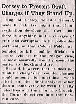 Hugh M. Dorsey, Solicitor General, made it plain last night that if investigation develops the fact that there is anything in the charges of graft and corruption in the police department, or that Colonel Felder attempted to bribe public officials to secure evidence in the Phagan case, he most assuredly would present the matter to the Grand Jury.