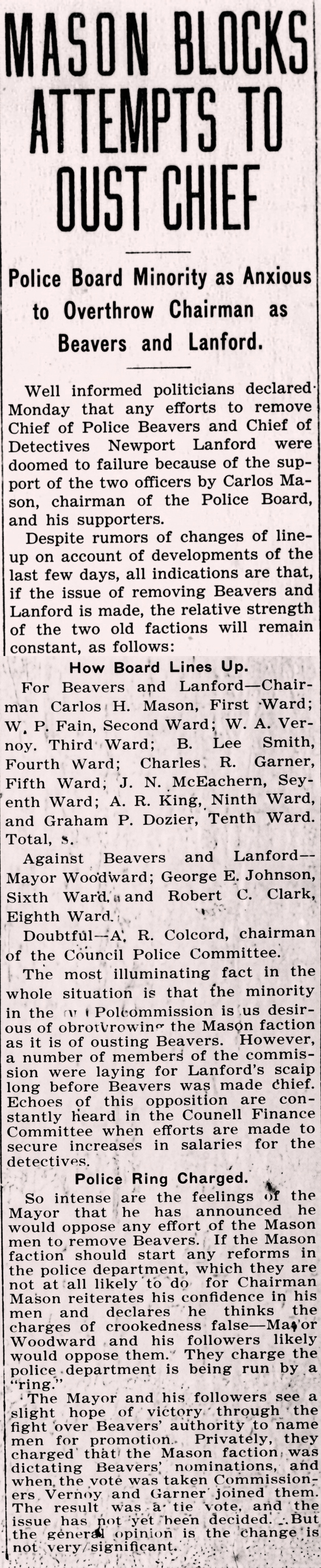 So intense are the feelings of the Mayor that he has announced he would oppose any effort of the Mason men to remove Beavers. If the Mason faction should start any reforms in the police department, which they are not at all likely to do—for Chairman Mason reiterates his confidence in his men, and declares he thinks the charges of crookedness are false—Mayor Woodward and his followers likely would oppose them. They charge the police department is being run by a "ring."