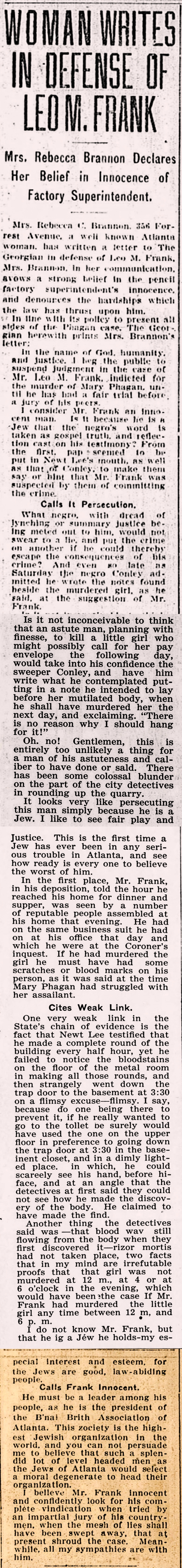 Mrs. Rebecca C. Brannon, 356 Forest Avenue, a well known Atlanta woman, has written a letter to The Georgian in defense of Leo M. Frank. Mrs. Brannon, in her communication, avows a strong belief in the pencil factory superintendent's innocence, and denounces the hardships which the law has thrust upon him.