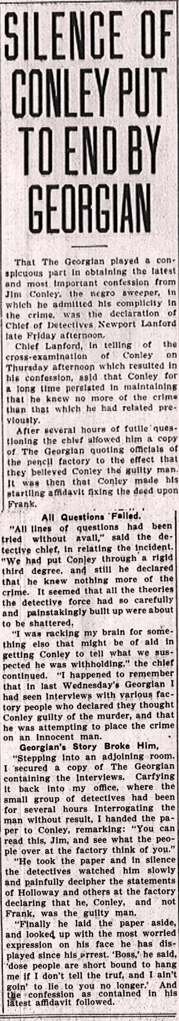 "I was racking my brain for something else that might of aid in getting Conley to tell what we suspected he was withholding," the chief continued. "I happened to remember that in last Wednesday's Georgian I had seen interviews with various factory people who declared they thought Conley guilty of the murder, and that he was attempting to place the crime on an innocent man.