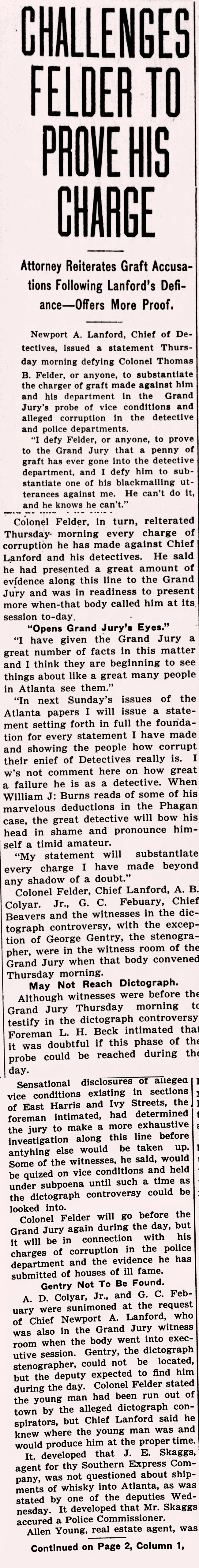 Colonel Felder, in turn, reiterated Thursday morning every charge of corruption he has made against Chief Lanford and his detectives. He said he had presented a great amount of evidence along this line to the Grand Jury and was in readiness to present more when that body called him at its session to-day.