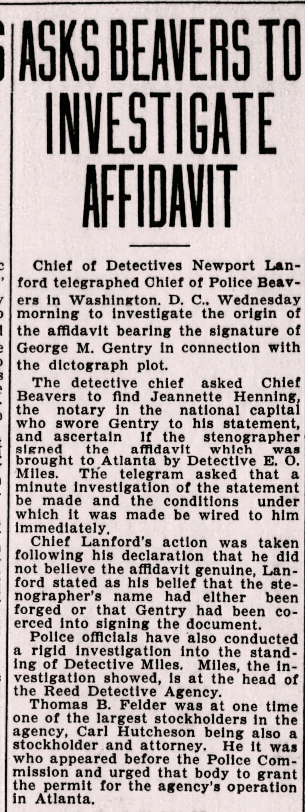 The detective chief asked Chief Beavers to find Jeannette Henning, the notary in the national capital who swore Gentry to his statement, and ascertain if the stenographer signed the affidavit which was brought to Atlanta by Detective E. O. Miles. The telegram asked that a minute investigation of the statement be made and the conditions under which it was made be wired to him immediately.