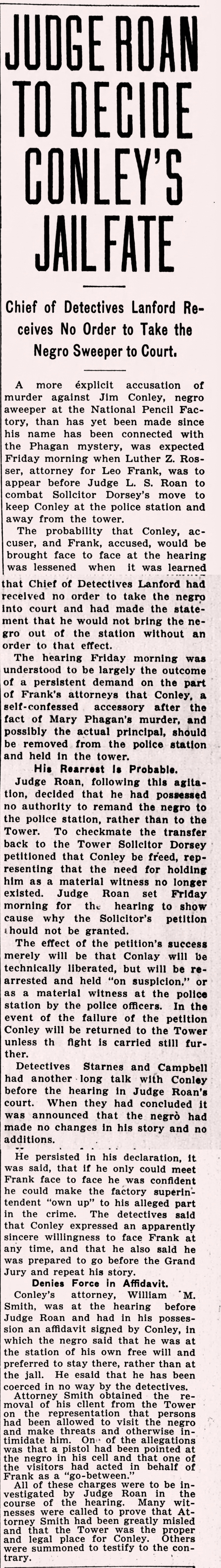 Judge Roan, following this agitation, decided that he had possessed no authority to remand the negro to the police station, rather than to the Tower. To checkmate the transfer back to the Tower Solicitor Dorsey petitioned that Conley be freed, representing that the need for holding him as material witness no longer existed. Judge Roan set Friday morning for the hearing to show cause why the Solicitor's petition should not be granted.
