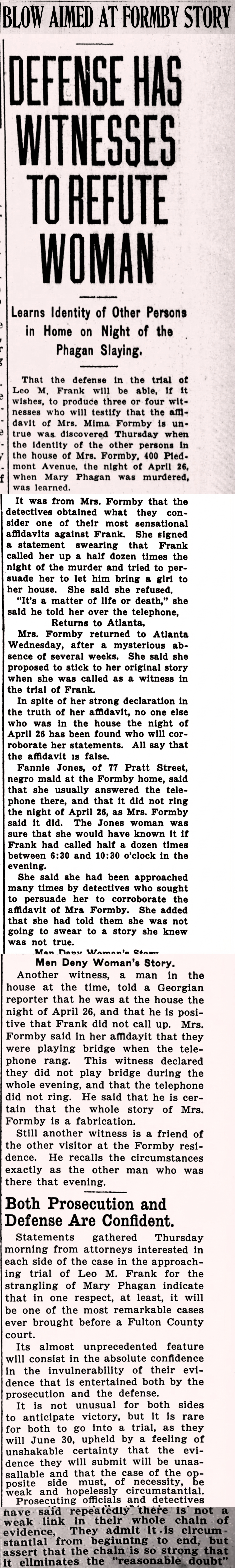 That the defense in the trial of Leo M. Frank will be able, if it wishes, to produce three or four witnesses who will testify that the affidavit of Mrs. Mima [sic] Formby is untrue was discovered Thursday when the identity of the other persons in the house of Mrs. Formby, 400 Piedmont Avenue, the night of April 26, when Mary Phagan was murdered, was learned.