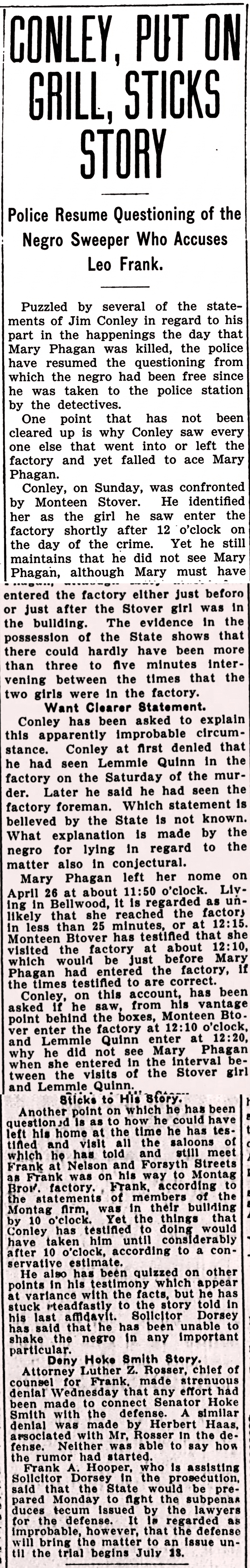 Conley has been asked to explain this apparently improbable circumstance. Conley at first denied that he had seen Lemmie Quinn in the factory on the Saturday of the murder. Later he said he had seen the factory foreman. Which statement is believed by the State is not known. What explanation is made by the negro for lying in regard to the matter also is conjectural.