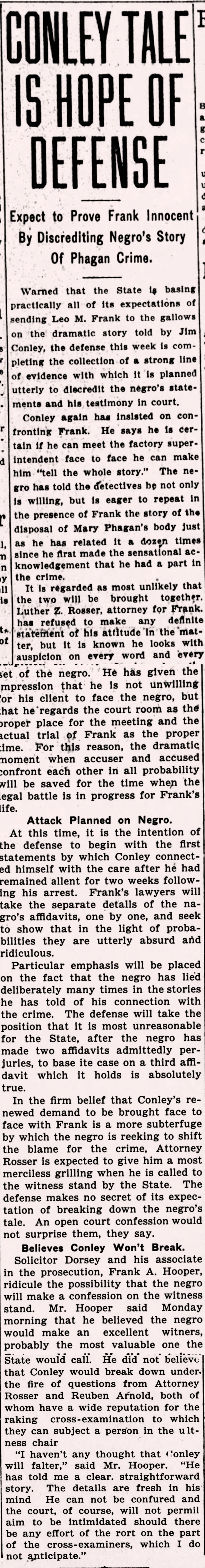 In the firm belief that Conley's renewed demand to be brought face to face with Frank is a mere subterfuge by which the negro is seeking to shift the blame for the crime, Attorney Rosser is expected to give him a most merciless grilling when he is called to the witness stand by the State. The defense makes no secret of its expectation of breaking down the negro's tale. An open court confession would not surprise them, they say.