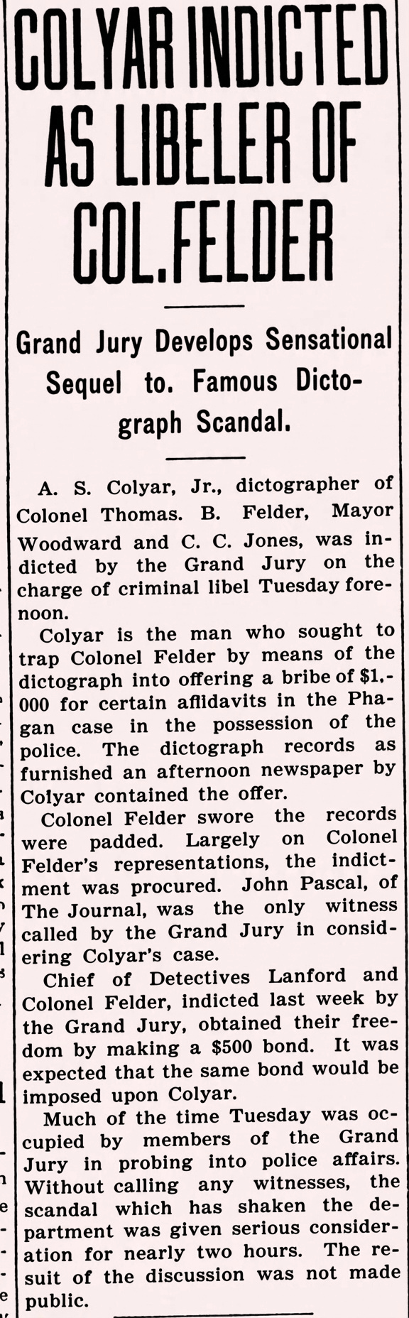 A. S. Colyar, Jr., dictographer of Colonel Thomas B. Felder, Mayor Woodward and C. C. Jones, was indicted by the Grand Jury on the charge of criminal libel Tuesday forenoon.
