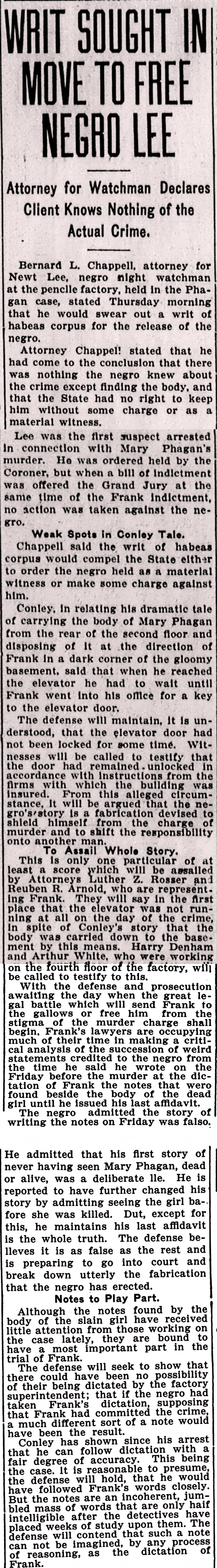 Bernard L. Chappell, attorney for Newt Lee, negro night watchman at the pencile [sic] factory, held in the Phagan case, stated Thursday morning that he would swear out a writ of habeas corpus for the release of the negro.