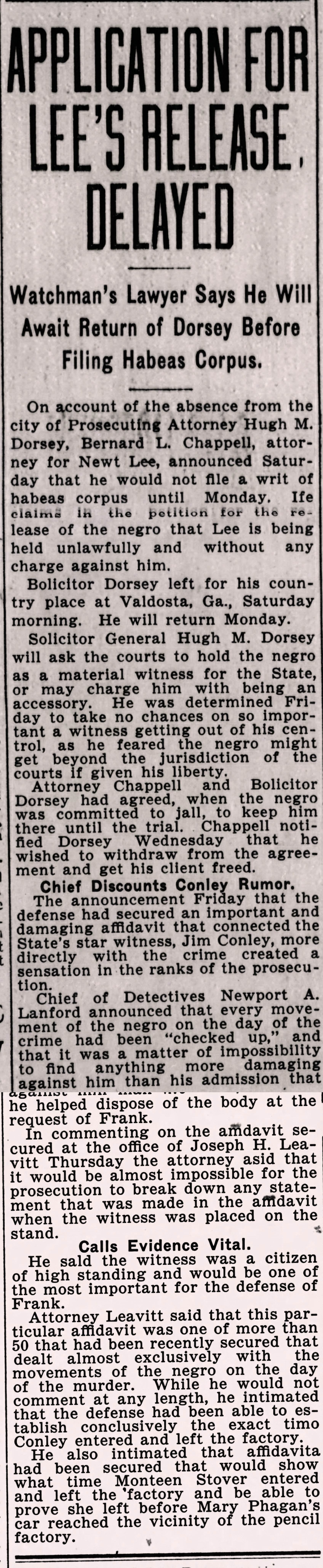 On account of the absence form the city of Prosecuting Attorney Hugh M. Dorsey, Bernard L. Chappell, attorney for Newt Lee, announced Saturday that he would not file a writ of habeas corpus until Monday. He claims in the petition for the release of the negro that Lee is being held unlawfully and without any charge against him.