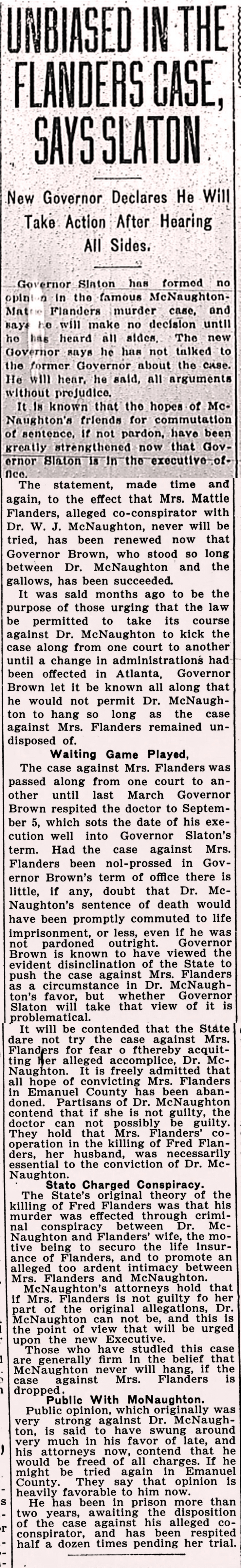 It was said months ago to be the purpose of those urging that the law be permitted to take its course against Dr. McNaughton to kick the case along from one court to another until a change in administrations had been effected in Atlanta. Governor Brown let it be known all along that he would not permit Dr. McNaughton to hang so long as the case against Mrs. Flanders remained undisposed of.