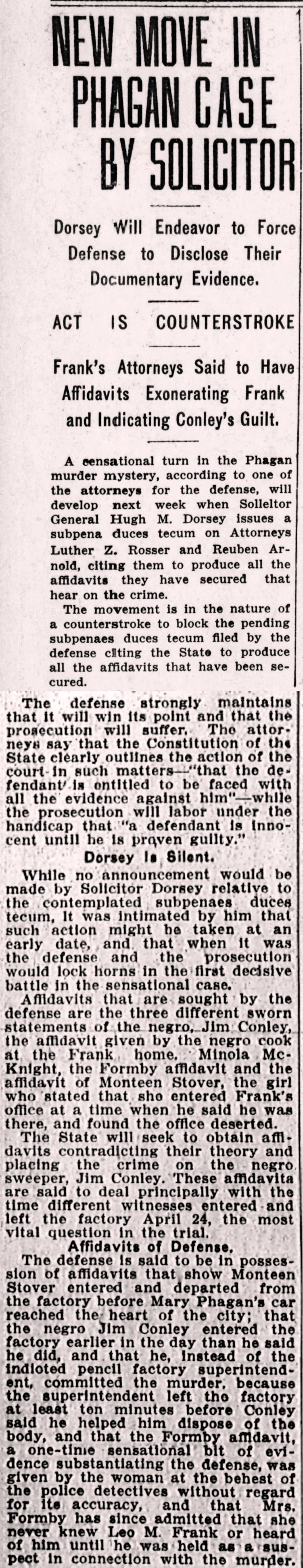 Affidavits that are sought by the defense are the three different sworn statements of the negro, Jim Conley, the affidavit given by the negro cook at the Frank home, Minola McKnight, the Formby affidavit and the affidavit of Monteen Stover, the girl who stated that she entered Frank's office at a time when he said he was there, and found the office deserted.