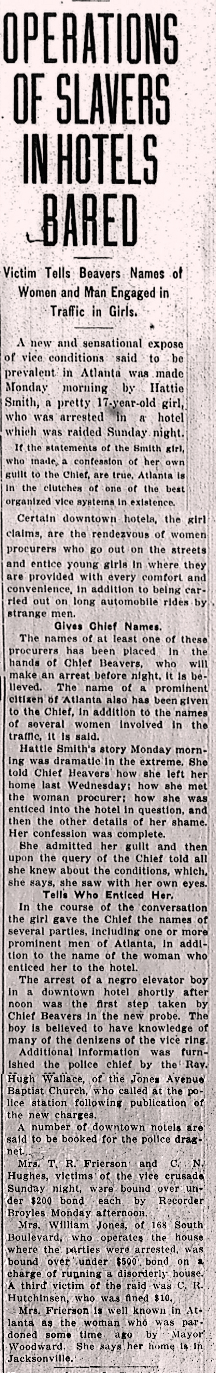 A new and sensational expose of vice conditions said to be prevalent in Atlanta was made Monday morning by Hattie Smith, a pretty 17-year-old girl, who was arrested in a hotel which was raided Sunday night.