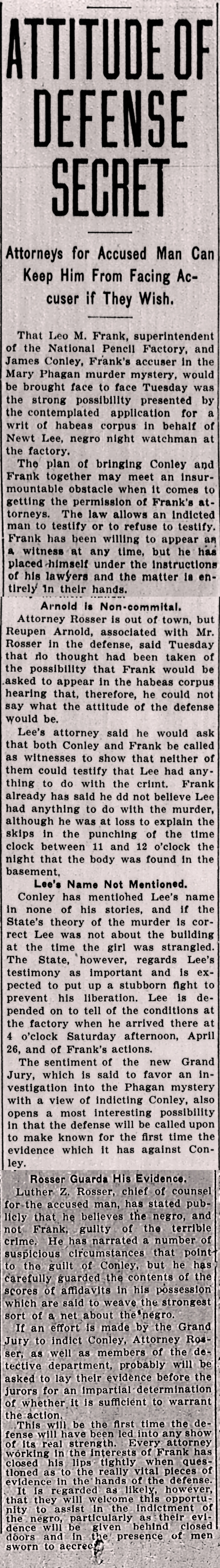 Conley has mentioned Lee's name in none of his stories, and if the State's theory of the murder is correct Lee was not about the building at the time the girl was strangled. The State, however, regards Lee's testimony as important and is expected to put up a stubborn fight to prevent his liberation. Lee is depended on to tell of the conditions at the factory when he arrived there at 4 o'clock Saturday afternoon, April 26, and of Frank's actions.