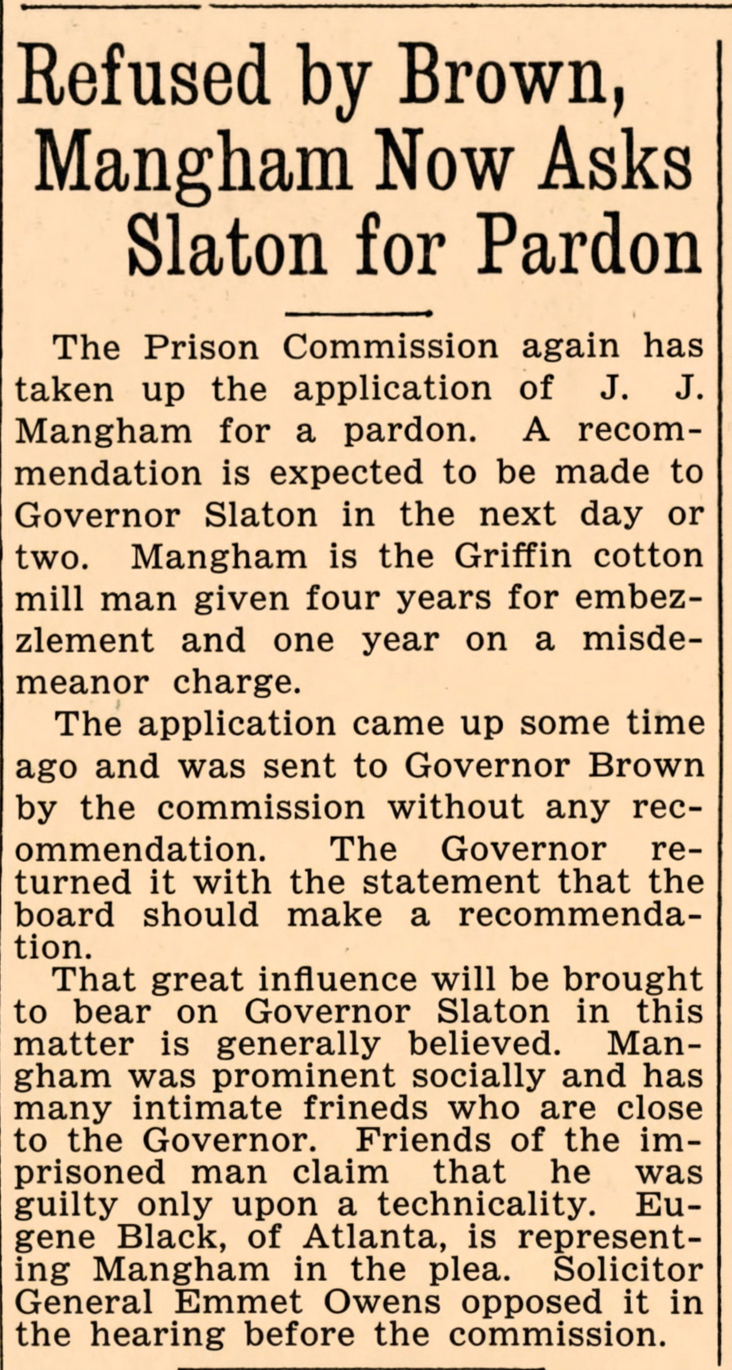 That great influence will be brought to bear on Governor Slaton in this matter is generally believed. Mangham was prominent socially and has many intimate frineds [sic] who are close to the Governor. Friends of the imprisoned man claim that he was guilty only upon a technicality. Eugene Black, of Atlanta, is representing Mangham in the plea. Solicitor General Emmet Owens opposed it in the hearing before the commission.