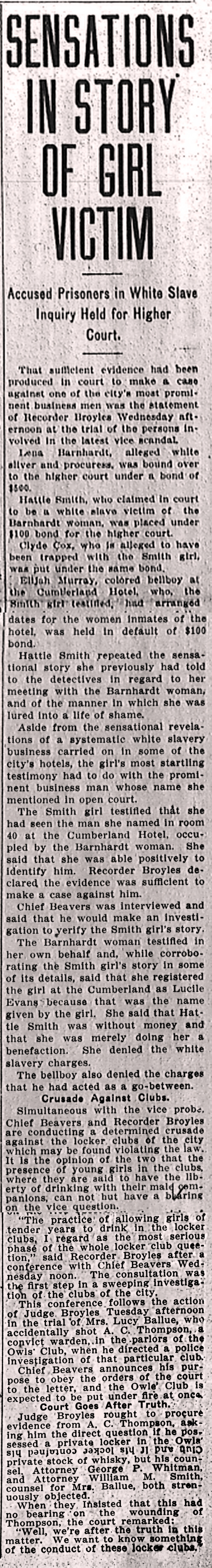 Hattie Smith repeated the sensational story she previously had told to the detectives in regard to her meeting with the Barnhardt woman, and of the manner in which she was lured into a life of shame.