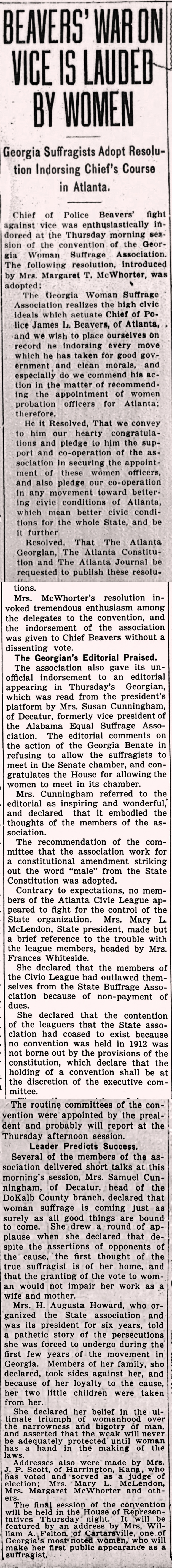 Chief of Police Beavers' fight against vice was enthusiastically indorsed at the Thursday morning session of the convention of the Georgia Woman Suffrage Association. The following resolution, introduced by Mrs. Margaret T. McWhorter, was adopted: