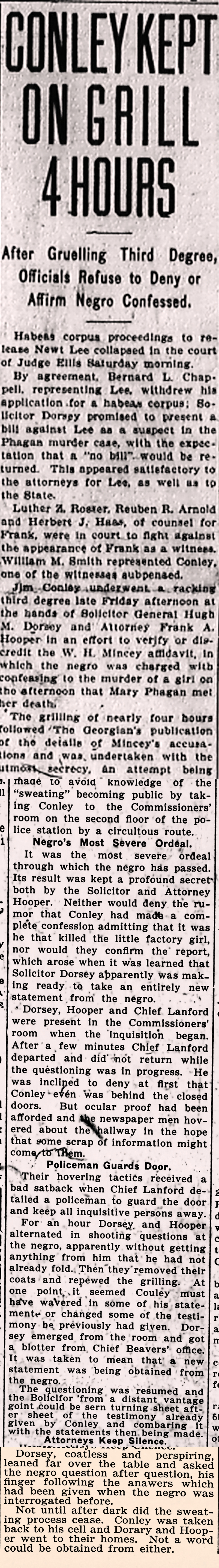 The grilling of nearly four hours followed The Georgian's publication of the details of Mincey's accusations and was undertaken with the utmost secrecy, an attempt being made to avoid knowledge of the "sweating" becoming public by taking Conley to the Commissioners' room on the second floor of the police station by a circuitous route.