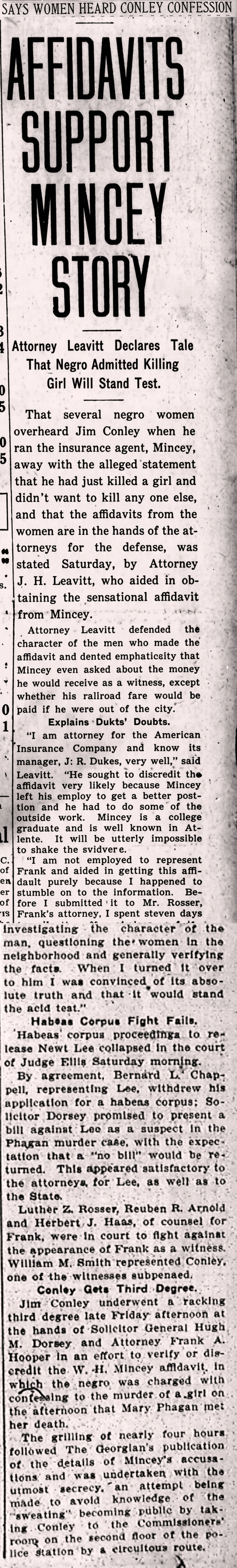 That several negro women overheard Jim Conley when he ran the insurance agent, Mincey, away with the alleged statement that he had just killed a girl and didn't want to kill any one else, and that the affidavits from the women are in the hands of the attorneys for the defense, was stated Saturday by Attorney J.H. Leavitt, who aided in obtaining the sensational affidavit from Mincey.