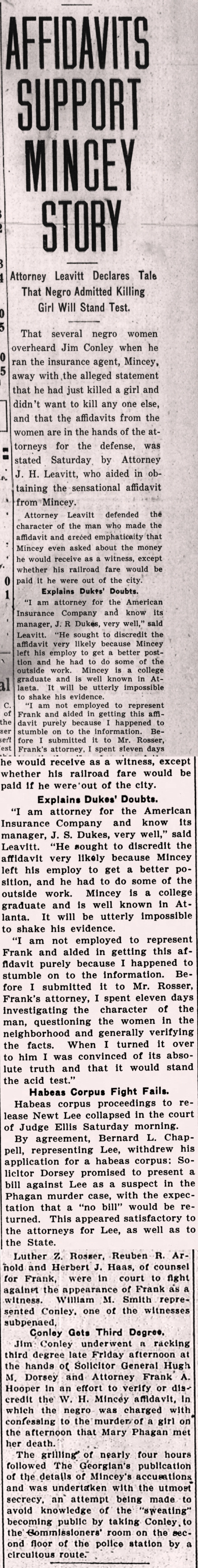 That several negro women overheard Jim Conley when he ran the insurance agent, Mincey, away with the alleged statement that he had just killed a girl and didn't want to kill anyone else, and that the affidavits from the women are in the hands of the attorneys for the defense, was stated Saturday by Attorney J.H. Leavitt, who aided in obtaining the sensational affidavit from Mincey.