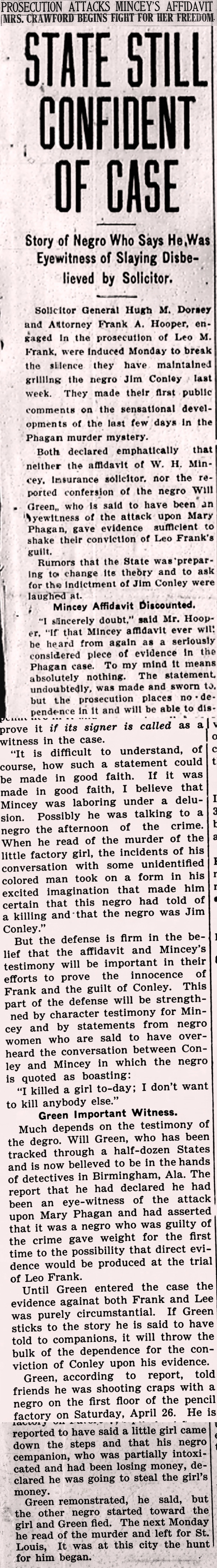 "I sincerely doubt," said Mr. Hooper, "if that Mincey affidavit ever will be heard from again as a seriously considered piece of evidence in the Phagan case. To my mind it means absolutely nothing. The statement, undoubtedly, was made and sworn to, but the prosecution places no dependence in it and will be able to disprove it if its signer is called as a witness in the case.