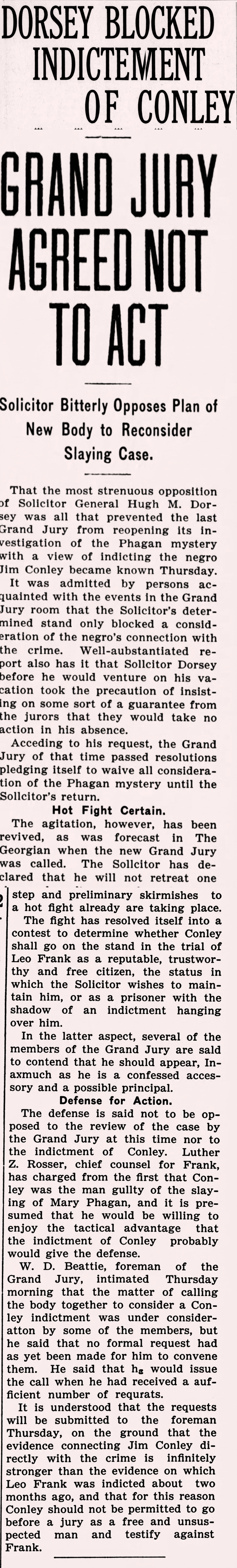That the most strenuous opposition of Solicitor General Hugh M. Dorsey was all that prevented the last Grand Jury from reopening its investigation of the Phagan mystery with a view of indicting the negro Jim Conley became known Thursday.