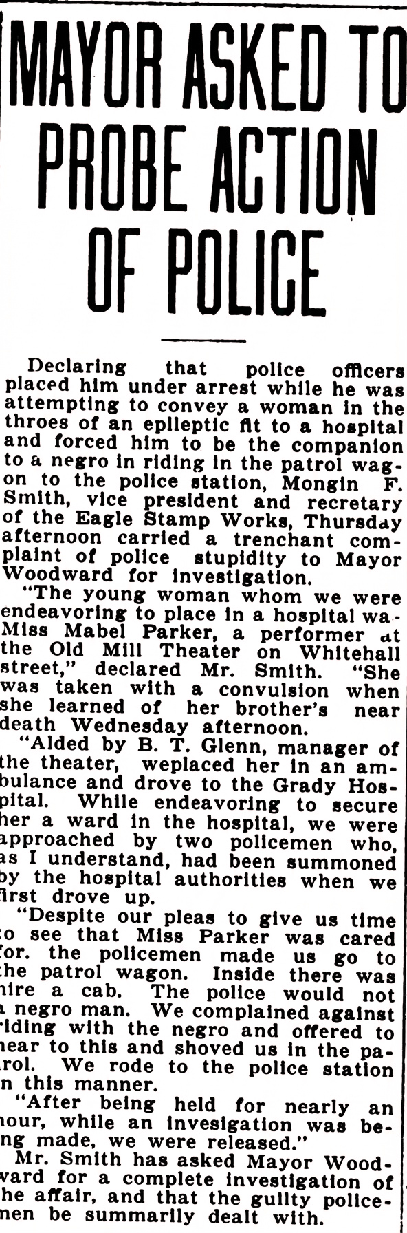 "Aided by B.T. Glenn, manager of the theater, we placed her in an ambulance and drove to the Grady Hospital. While endeavoring to secure her a ward in the hospital, we were approached by two policemen who, as I understand, had been summoned by the hospital authorities when we first drove up.