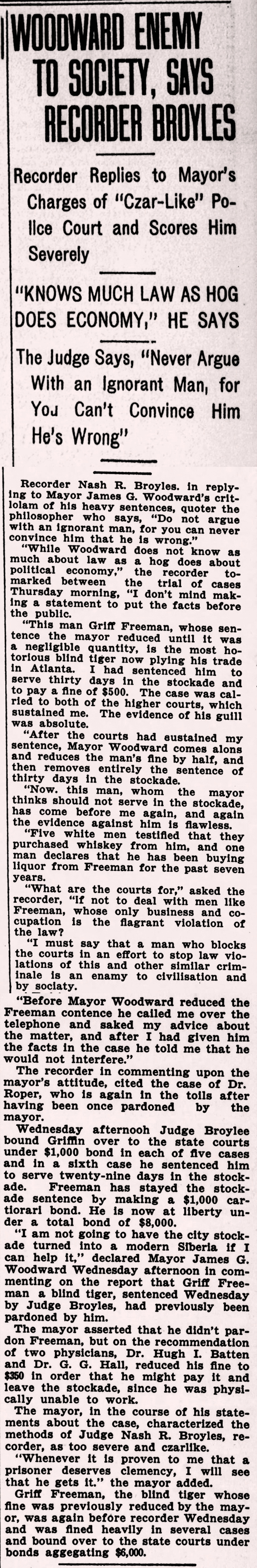 "This man Griff Freeman, whose sentence the mayor reduced until it was a negligible quantity, is the most notorious blind tiger now plying his trade in Atlanta. I had sentenced him to serve thirty days in the stockade and to pay a fine of $500. The case was carried to both of the higher courts, which sustained me. The evidence of his guilt was absolute.