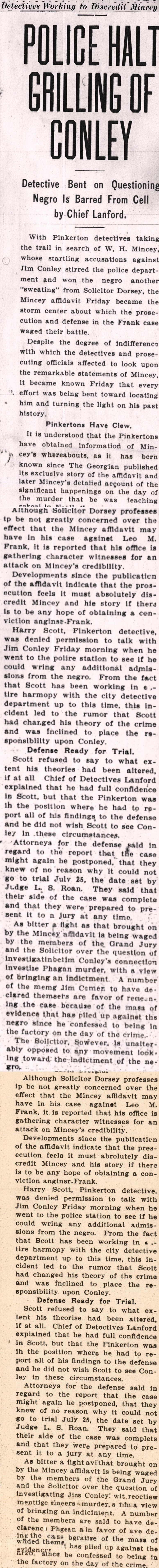 With Pinkerton detectives taking the trail in search of W.H. Mincey, whose startling accusations against Jim Conley stirred the police department and won the negro another "sweating" from Solicitor Dorsey, the Mincey affidavit Friday became the storm center about which the prosecution and defense in the Frank case waged their battle.
