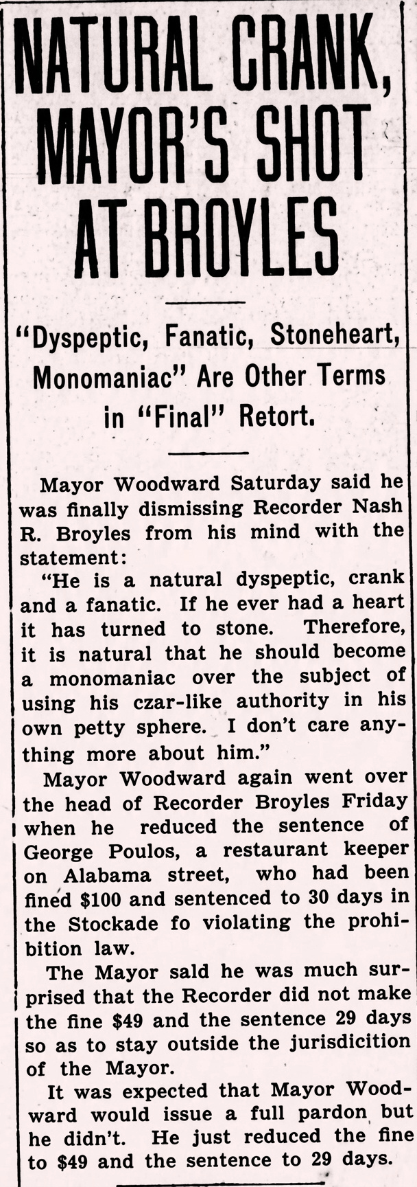 Mayor Woodward again went over the head of Recorder Broyles Friday when he reduced the sentence of George Poulos, a restaurant keeper on Alabama street, who had been fined $100 and sentenced to 30 days in the Stockade fo [sic] violating the prohibition law.