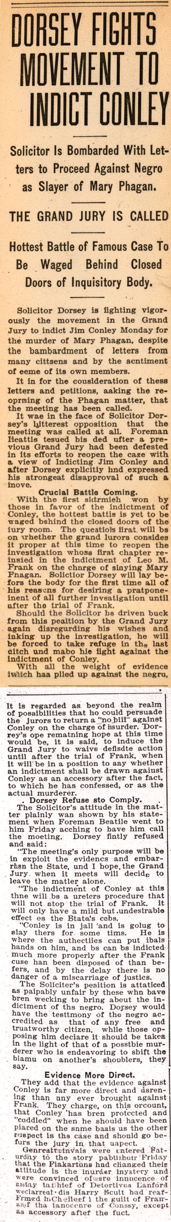 With the first skirmish won by those in favor of the indictment of Conley, the hottest battle is yet to be waged behind the closed doors of the jury room. The question first will be on whether the grand jurors consider it proper at this time to reopen the investigation whose first chapter resulted in the indictment of Leo M. Frank on the charge of slaying Mary Phagan. Solicitor Dorsey will lay before the body for the first time all of his reasons for desiring a postponement of all further investigation until after the trial of Frank.